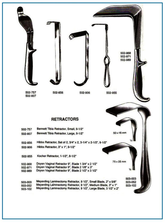 | Bennett Tibia Retractor | Orthopedic tibia surgeries | Angled, large blade for retraction |
