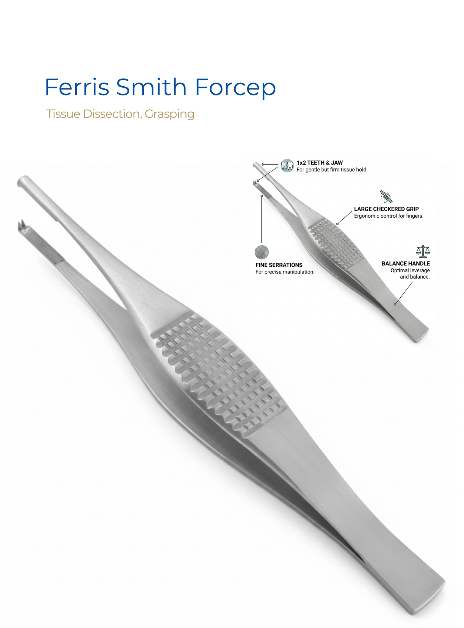 | Ferris Smith Forcep | Grasping and stabilizing tissue layers during open dissection, vessel handling, and wound closure in general and cardiovascular surgery | Straight shaft, serrated platform with 1×2 interlocking tips, spring-action ring-free handle, pyramid-textured thumb grip |