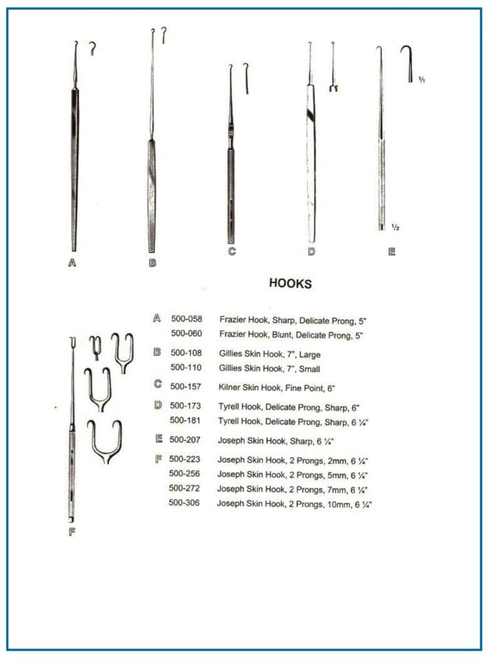 | Kilner Skin Hook, Fine Point, 6″ | Skin manipulation in cosmetic surgeries | Fine-point design |