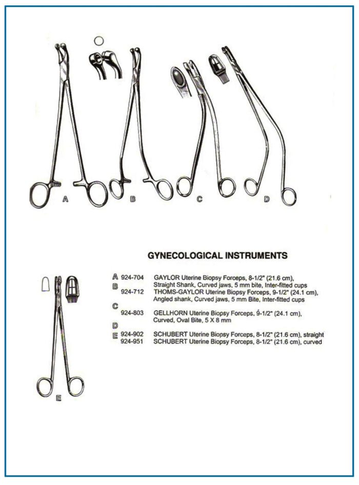 Uterine biopsy forceps assist in gynecological tissue extraction. Designs include straight, curved, and angled shanks with inter-fitted or oval bites.