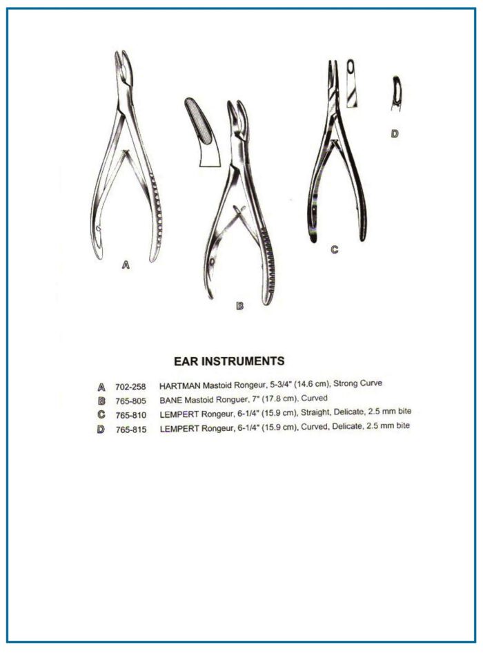 | Hartman Mastoid Rongeur | Bone removal in mastoidectomy | Strong curve, 5-3/4″ (14.6 cm) |