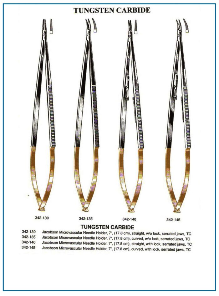 | Jacobson Microvascular Needle Holder (Curved, w/o Lock, Serrated Jaws, TC) | Microvascular suturing | Curved, serrated jaws, TC |