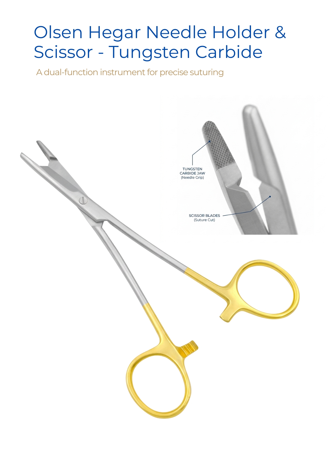 Olsen Hegar needle holder with built-in suture scissors: straight ring-handle design with TC-tip jaws for controlled needle placement and suture trimming in a single instrument.A two-in-one needle holder with scissors combining the functions of a needle driver and suture scissor for plastic surgery, orthopedic, and dental suturing workflows. [ Choose Packs: 1 Pack (5 Pcs) | 2 Packs (10 Pcs) | 3 Packs ( 15 Pcs) ]