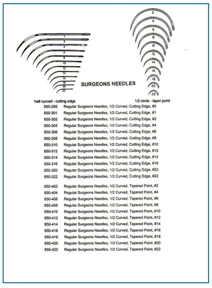 | Regular Surgeons Needles, 1/2 Curved, Cutting Edge | Suturing in general surgery | 1/2 curved, sharp cutting edge |