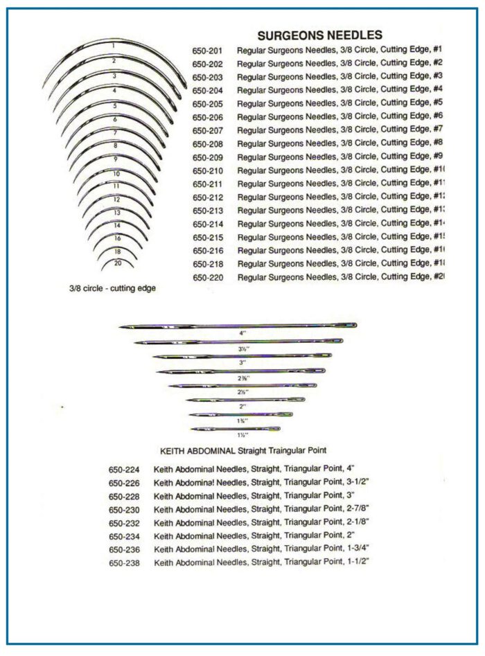 - Sizes: #1 to #20 (Regular Surgeons Needles), 1-3/4″ to 4″ (Keith Abdominal Needles)