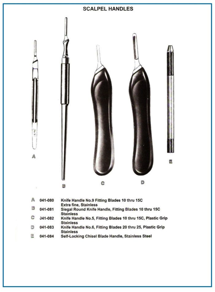 | Knife Handle No. 6 | Fits blades 20-25, used in orthopedic and deep incisions | Plastic grip, stainless steel |