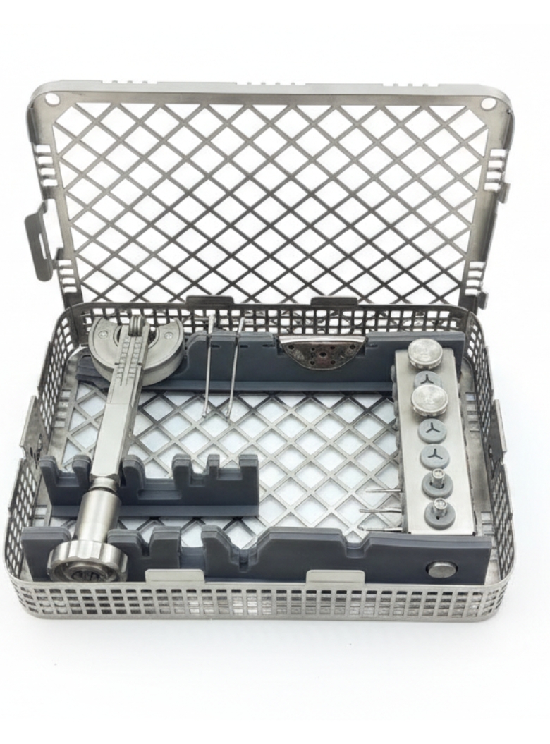 The kit includes an extractor, pullropes, driver guides, screws, diamond-coated drills, quadrant support, and sterilization tray system.
